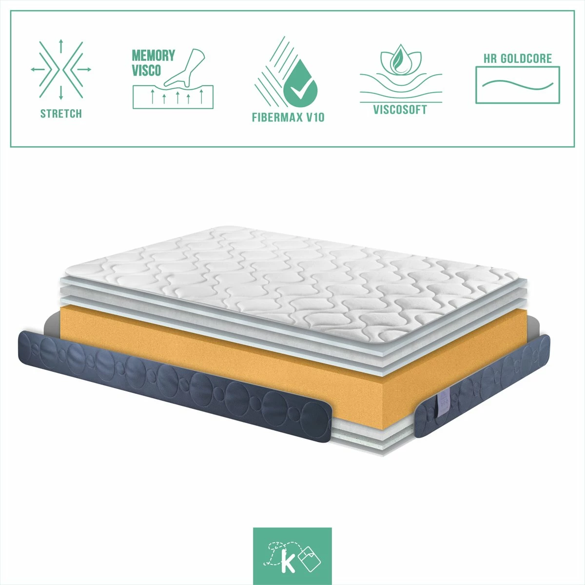El colchón Extreme Comfort de firmeza media-alta con VISCOAIR PRO, con una altura de ±23cm perfecto para conseguir un gran confort y comodidad. Este colchón está compuesto por dos caras: CARA INVIERNO. El Tejido STRETCH de tacto suave, cómodo y agradable, resultado de una variedad de hilos entrelazados para conseguir el máximo confort y adaptabilidad posible. Al ser transpirable evita que la humedad se condense y se puedan producir humedades, mejorando su rendimiento y durabilidad. Tejido con certificado OEKO-TEX, libre de sustancias tóxicas en su producción. Sistema Confort Plus 4cm (VISCOAIR PRO. Sistema Confort Plus compuesto por materiales de última generación para mejorar la sensación de adaptabilidad. Compuesto por ViscoAir Pro, fibras FIBERMAX V10 y SoftFoam. Acolchado con FIBERMAX V10, el resultado de seleccionar cuidadosamente fibras hipoalergénicas y someterlas a un tratamiento de iones hipoalergénico, antiácaros y antibacterianos proporcionando transpirabilidad al descanso a la vez que evita la proliferación de bacterias para una mayor higiene. Reduciendo la aparición de alergias y consiguiendo una temperatura constante del colchón. Permite la libre circulación del aire ventilando continuamente el núcleo de nuestro colchón. CARA DE VERANO. El tejido 3D AirFresh Blanco es ideal para la cara de verano de nuestro colchón, ya que es un tejido tridimensional altamente transpirable y flexible, siendo especialmente indicado para la dispersión de la humedad y mejora del descanso. Sistema de adapt plus. Sistema compuesto por fibras hipoalergénicas y SoftFoam. Las fibras hipoalergénicas proporcionan un alto grado de confort además de dotar al colchón de una mayor transpirabilidad e higiene; y el SoftFoam permite que el acolchado tenga una mayor suavidad y proporcione un descanso más adaptable. Acolchado con FIBERMAX V10. NÚCLEO. HR-GoldCORE. Núcleo de HR (High Resilience que permite una mayor firmeza. Núcleo de alta densidad, 26kg/m3, mejorando la sensación de confort en el descanso y un soporte estable a la vez que suave. Su estructura microcelular de poro abierto permite que tenga una mayor transpirabilidad y disipe el calor. Nuestro HR-Gold tiene una mayor durabilidad y resistencia gracias a su capacidad de volver a su estado inicial.