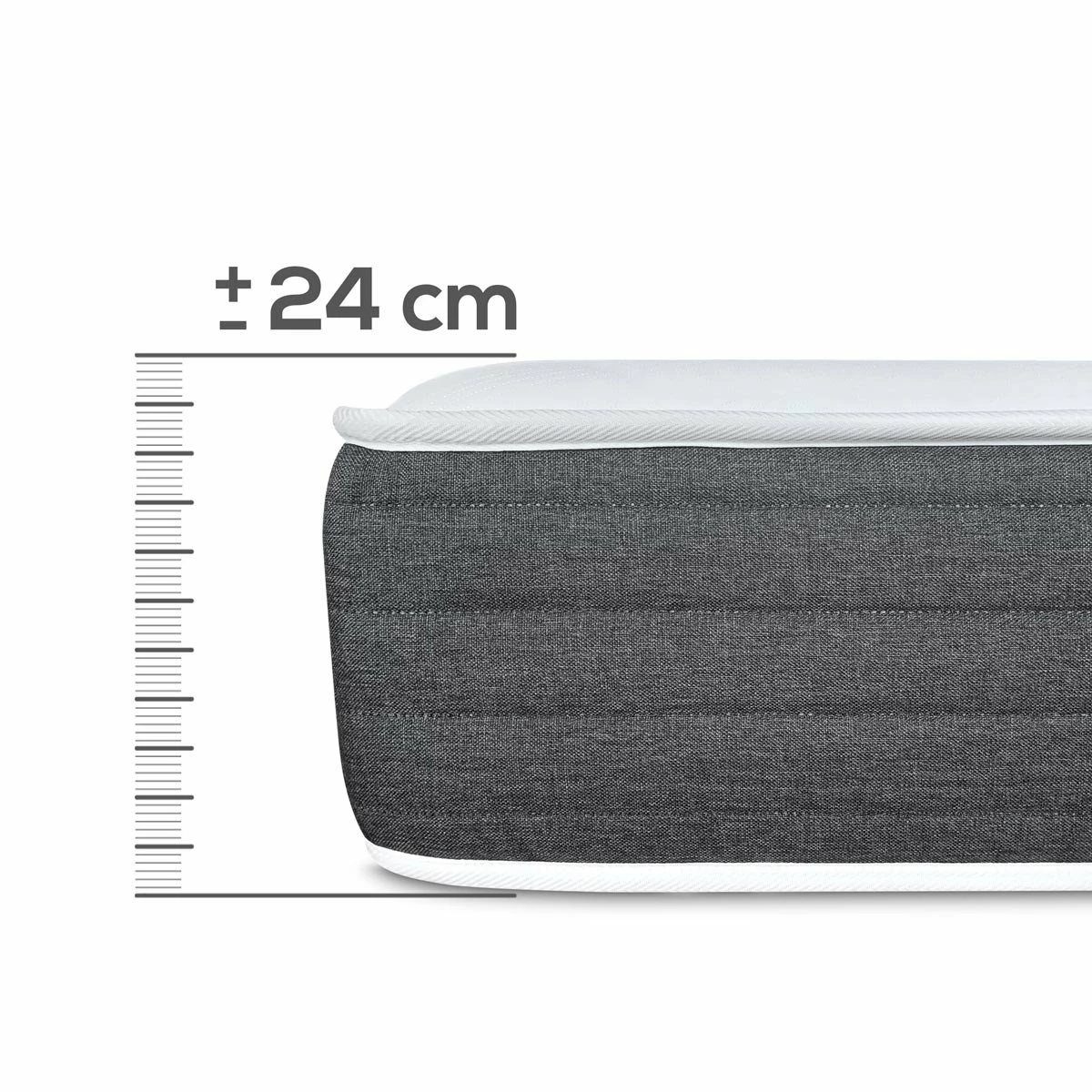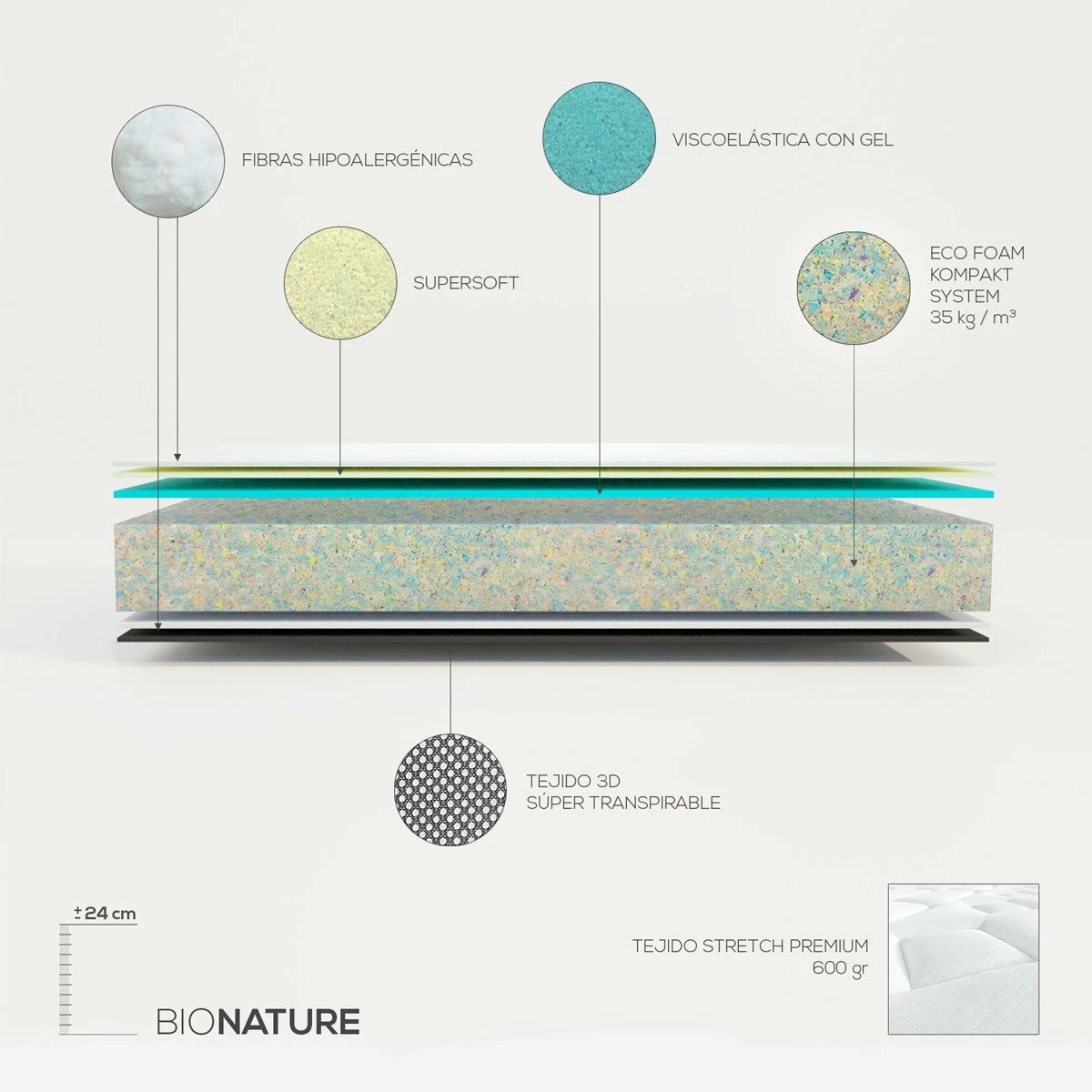 Diseño y calidad: El colchón viscoelástico Bio Nature incorpora un núcleo de espuma de alta densidad ecosostenible KOMPAKT SYSTEM FOAM con gran densidad y alta recuperación, totalmente transpirable. 100% Reciclable, que nos aporta firmeza, junto a su exclusivo y comodísimo acolchado compuesto por 4cm de: Viscoelástica con gel + fibras hipoalergénicas + espuma súper suave, que proporcionan un descanso reparador y ayudan a mantener una temperatura óptima en todo momento, garantizando un confort total en cualquier época del año, además de una excelente aireación interna del colchón, elaborado con materiales 100% transpirables. Firmeza media-alta: colchón exclusivo, firme pero confortable, mantiene la columna en su posición más óptima. Higiénico y duradero: Colchón totalmente protegido de ácaros, bacterias y hongos, gracias al tratamiento Sanitized que incorpora en su tejido premium termorregulador de alto gramaje, evitando la aparición de reacciones alérgicas y aportando un tacto suave y sedoso; en la cara inferior incorpora tejido 3d súper transpirable para una total ventilación y aireación del colchón. Libertad de movimientos: independencia de lechos, de esa no notamos los movimientos del otro durmiente. Producto de confianza: fabricado de forma sostenible en españa, con certificados oekotex y certipur de ausencia de sustancias nocivas durante todo su proceso de elaboración; la seguridad y bienestar de los tuyos son lo primero; altura total 24cm (+/-2cm.