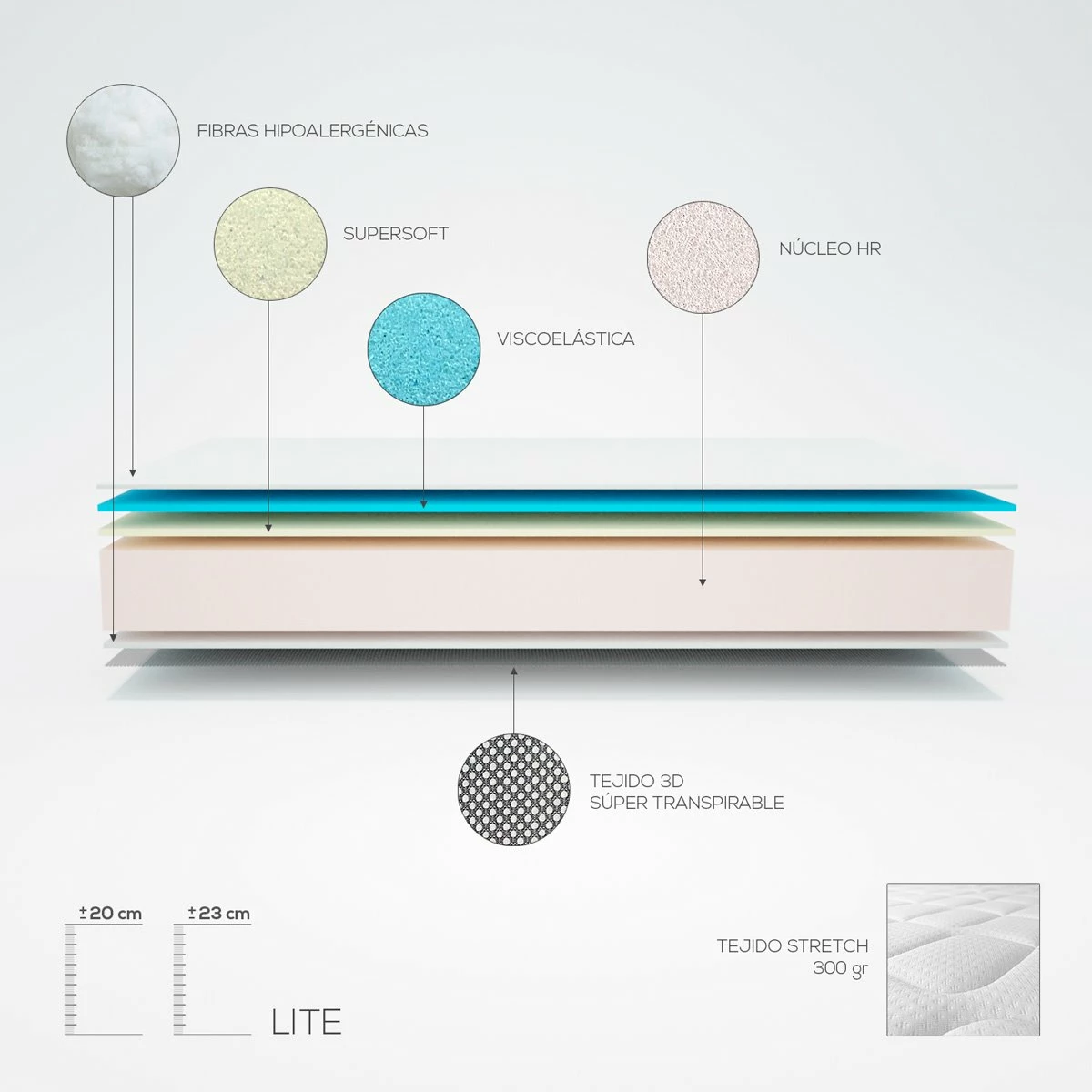 - Acolchado con Viscoelástica + viscosoft + fibras hipoalergénicas