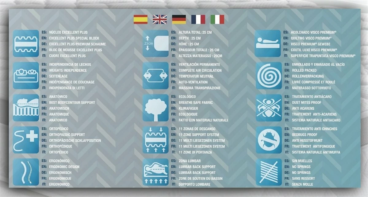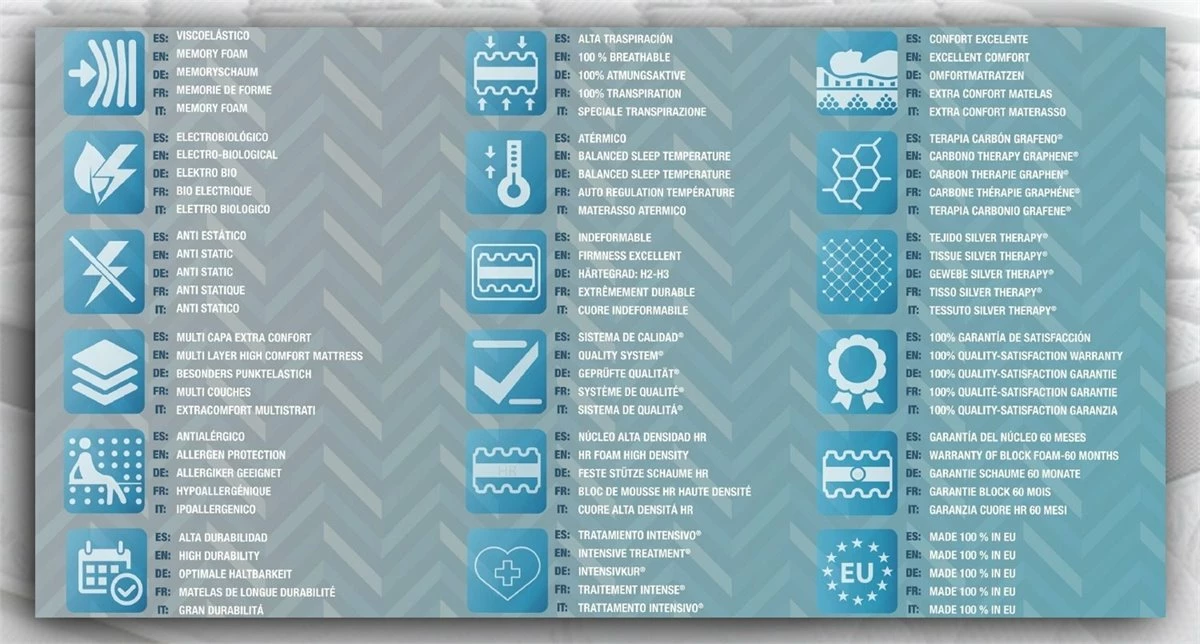 Núcleo Bio Plus H.R Resilence foam de altísima densidad de célula abierta, máxima transpiración. viscoelástica natural perfilada de muy alta densidad de poro transpirable 100% anticalor y de gran recuperación + tejido super suave Soft. Total capas 3 cm. Doble capa superior con cámaras de aire 3D AIR-ACTIVE reguladoras de la temperatura.Tacto de gran suavidad. Máximo confort. Hilo de Plata en sus acolchados con grandes propiedades antiestáticas, eliminación de olores y de sudoración. Terapia mineral natural. Tapa inferior compuesta de tejido con 3D Technology máxima transpiración + tejido Soft-Therm 350 grs + microcanales de ventilación anti humedad y anti sudoración. Sin puntos de presión sobre las 7 zonas de descanso. Refuerzo lumbar. Tecnología Sanitized, Anti-hongos, Anti-ácaros, Anti-Moho Traspiración permanente. Colchón Atérmico. Independencia de lechos. Indeformable. Tejidos especiales anti-ácaros, anti-bacterias, anti-moho. Control mundial de calidad OEKO TEX TEXTILES DE CONFIANZA. Máxima higiene, compromiso medioambiental. Anti alérgico, anti estático, electro biológico, anatómico. Perímetro reforzado, cosido especial de seguridad para una mejor compactibilidad. Grosor +/- 21 cm. Certificado SISTEMA DE MÁXIMA CALIDAD.
