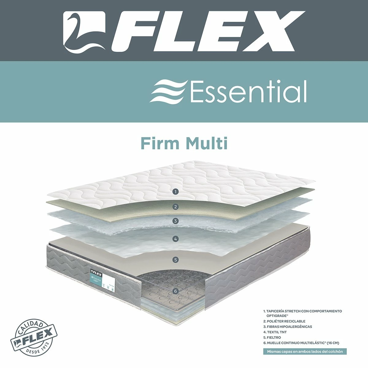 Colchón de Muelles Multielástic® (16 cm, tecnologíaexclusiva Flex®, que garantizan el comportamiento óptimo del colchón en laadaptación al cuerpo ya que modifica su firmeza y soporte en función de lapresión recibida. Tienen una elasticidad, indeformabilidad y durabilidadóptimas.