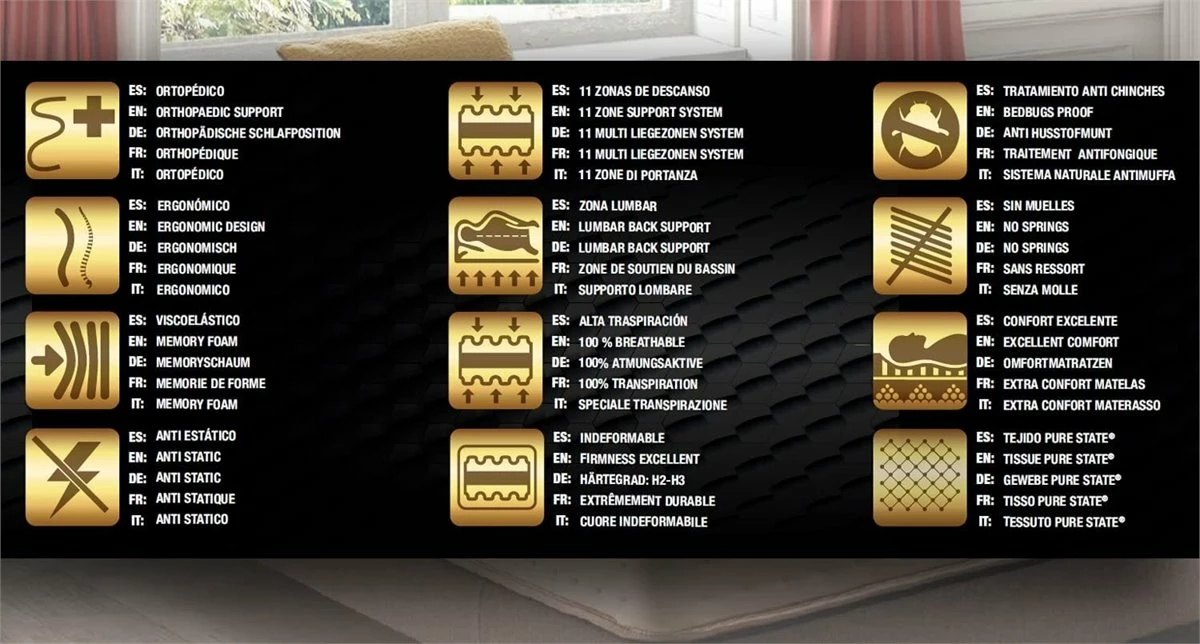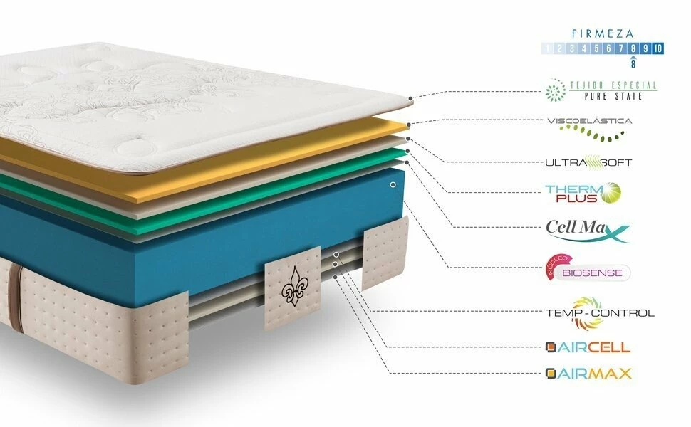 Tejido exterior especial alta gama Pure State de alto gramaje ayuda a evacuar la humedad y crear un entorno equilibrado para el descanso. Asas laterales con acabado lujo y con doble cosido de seguridad para un perfecto uso. Máxima independencia de lechos. No notará los movimientos del otro durmiente durante el descanso, gracias al material Excellent Plus.