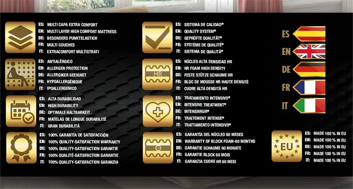 Alta durabilidad 10 años: La experiencia y la exclusividad en la fabricación de uno de los mayores fabricantes nacionales sumado a la gran calidad de los materiales que componen este colchón, asegura un mantenimiento óptimo de las condiciones y beneficios de este equipo de descanso. Certificado mundial de calidad Oeko Tex textiles de confianza. Certificado ISO 9001. Certificado CETEM. Garantía de 5 años. Made 100 % Spain. Máxima Calidad.