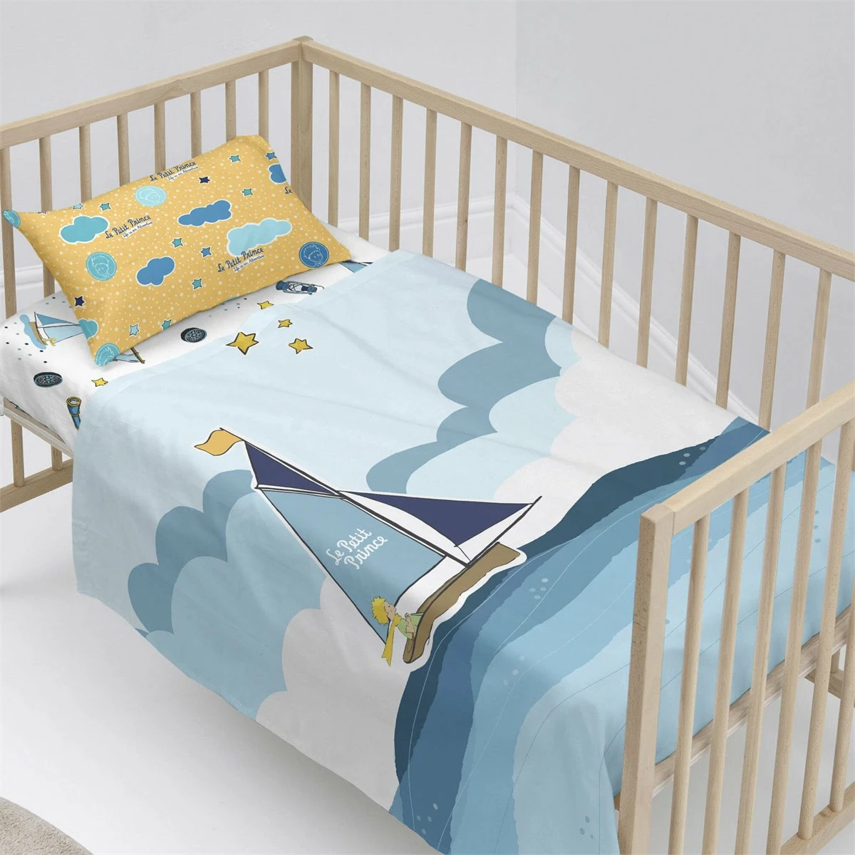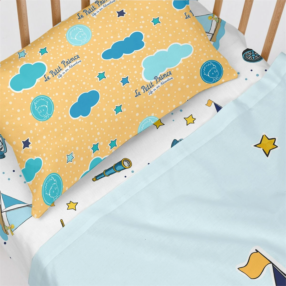 Si buscas un tema de inspiración náutica para la habitación de tu hijo, la sábana Navigateur de la colección Le Petit Prince les hará navegar durante la noche en la mejor compañía.La refrescante paleta de colores azules que se ve en esta sábana de algodón 100% se consigue gracias a la estampación digital de alta definición y contrasta con los tonos cálidos de la funda de almohada..Disponible en las siguientes tallas: * 160×270 [Cama 80/90](incluye funda de almohada 45×110. * 180×270 [Cama 105] (incluye funda de almohada 45×125.
