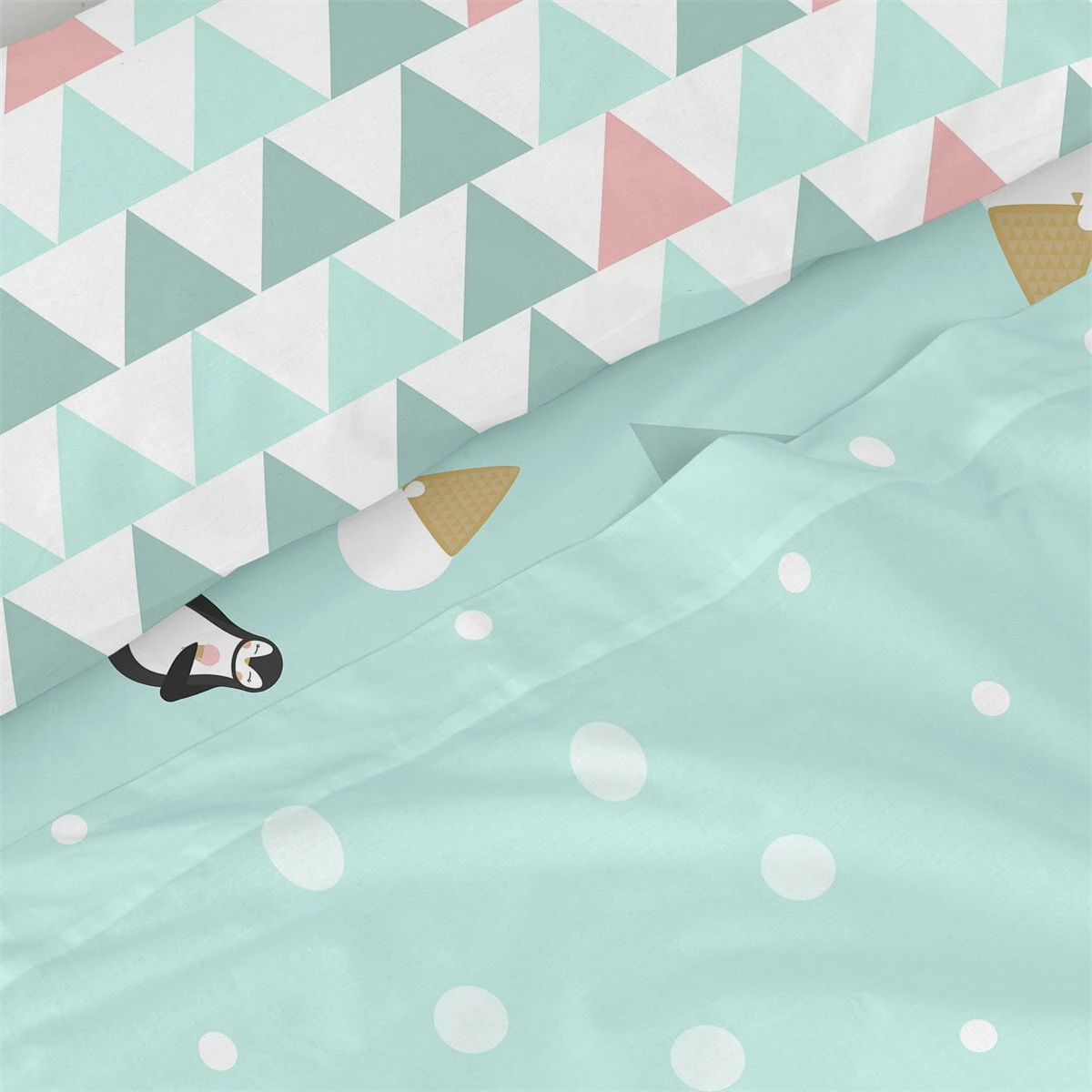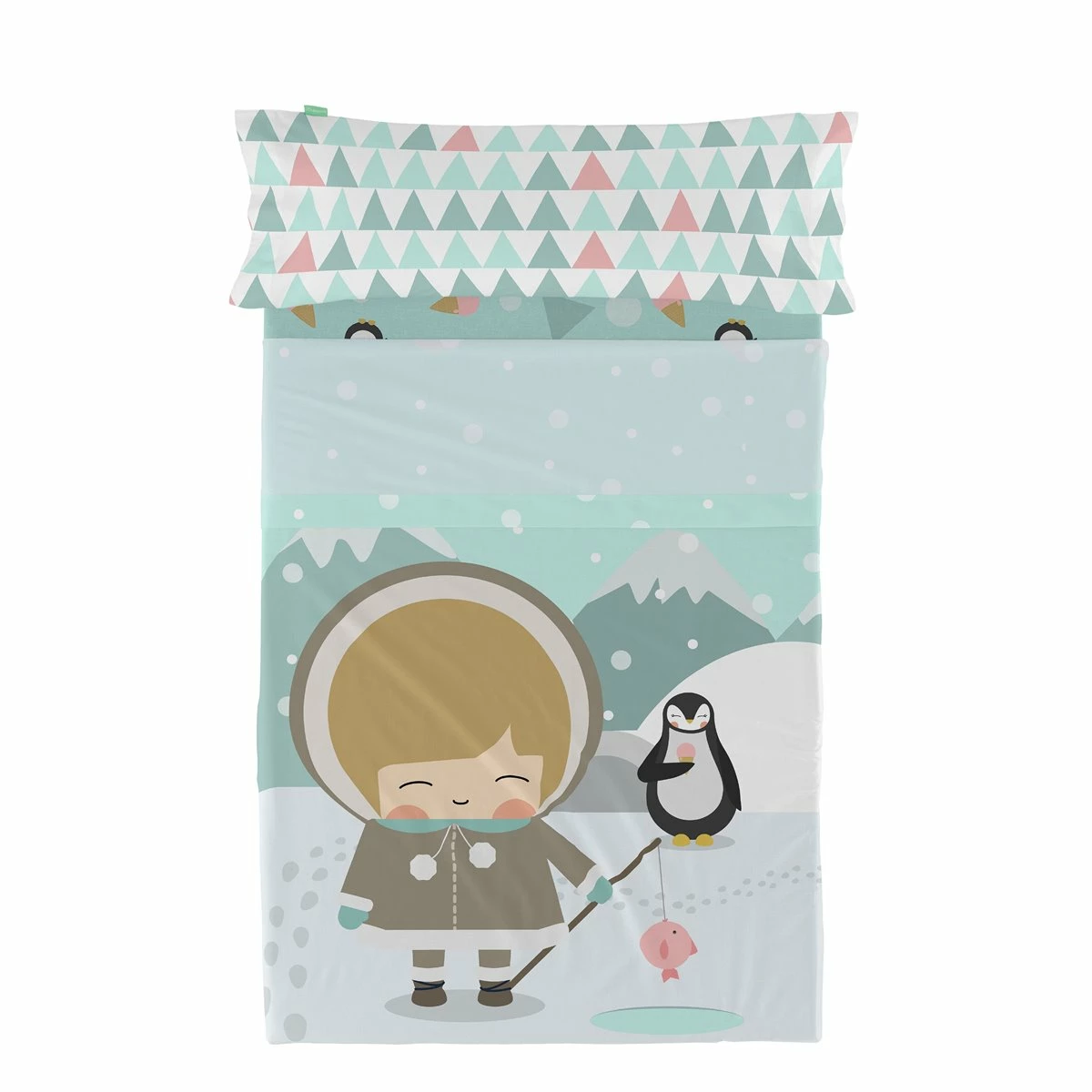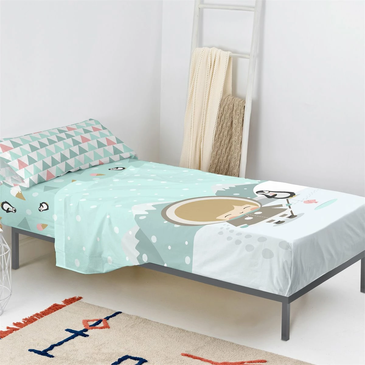 Trae la belleza del Polo Norte a la habitación de tu hijo con la sábana Skymo Day de la colección Happynois, donde los pingüinos se sienten como en casa, los peces esquimales en los agujeros de hielo y las casas están hechas de nieve. ¡Es genial!Hecha en España con 100% algodón, 150 hilos e impresa digitalmente en alta definición, esta sábana se puede mezclar y combinar con otros productos de la misma colección e incluye una funda de almohada estampada.Bajera no incluida.Disponible en las siguientes tallas: * 160×270 [ Cama 90 ] (incluye funda de almohada estampada 45×110. * 180×270 [ Cama 105 ] (incluye funda de almohada estampada 45×125.